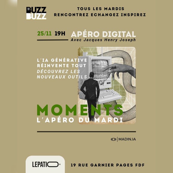 Apéro Digital : l’IA générative réinvente vos outils créatifs est un rendez‑vous convivial et professionnel ouvert à tous, organisé par Buzz Magazine Martinique en collaboration avec Madin.IA. Cet événement propose un moment d’échange informel autour d’un verre, centré sur la découverte et la réflexion autour de l’intelligence artificielle générative : comment elle transforme nos outils, notre travail et notre façon de créer.