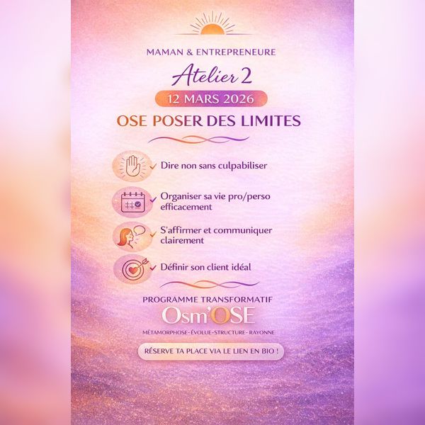 L’atelier Oser poser des limites s’inscrit dans le parcours d’accompagnement Osm’OSE, un programme pensé pour les femmes entrepreneures et en particulier les mamans qui souhaitent développer leur activité sans s’épuiser ni se sacrifier. Cet atelier propose un espace structuré pour apprendre à poser des limites claires dans sa vie professionnelle et personnelle.
