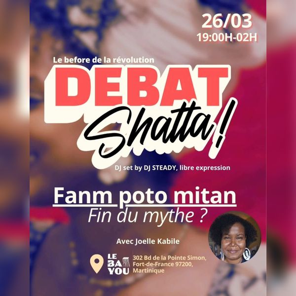 L'événement DébatShatta propose une soirée d'échanges consacrée à une figure centrale de l'imaginaire social martiniquais et caribéen : celle de la Fanm poto mitan. À travers cette rencontre, le public est invité à interroger la place de ce concept dans la société contemporaine, à réfléchir à son évolution et à débattre de sa portée actuelle dans les rapports sociaux, familiaux et culturels. Cette soirée prend la forme d'un afterwork ouvert, accessible et participatif, où chacun peut venir écouter, questionner, partager son ressenti et confronter ses idées dans un cadre propice à la discussion.