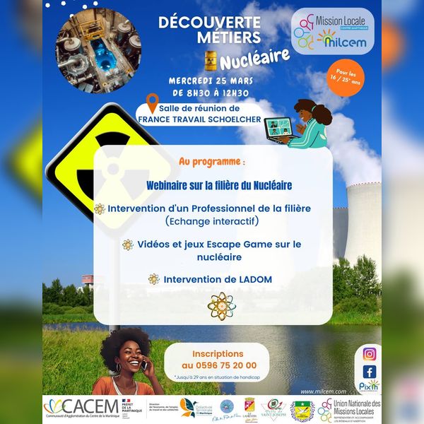 La Mission Locale Centre Martinique et le MILCEM organisent une matinée dédiée à la découverte des métiers du nucléaire, spécialement conçue pour les jeunes souhaitant explorer de nouvelles opportunités professionnelles. Cet événement vise à mieux faire connaître une filière stratégique, porteuse d’emplois et d’innovations, encore peu connue du grand public.