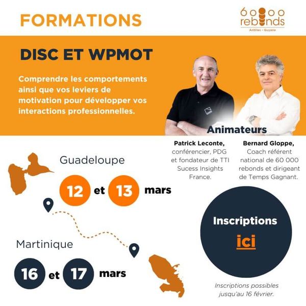 Dans le cadre de ses actions en faveur du rebond entrepreneurial, 60 000 Rebonds Antilles-Guyane propose une formation DISC exclusive destinée aux entreprises qui rejoignent son Club des mécènes. Cette initiative associe développement des compétences managériales et engagement territorial dans une dynamique à forte valeur ajoutée pour les dirigeants.