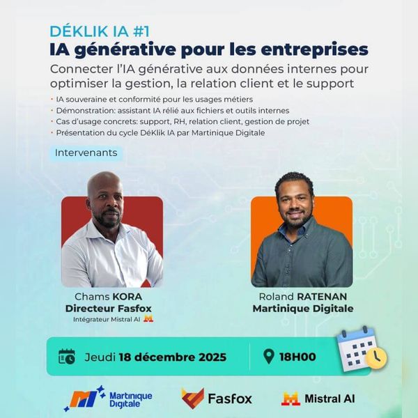 Deux intervenants viendront partager leurs expertises : Chams KORA, directeur de Fasfox, intégrateur de solutions Mistral AI, et Roland RATENAN de Martinique Digitale, qui présentera la vision stratégique de cette initiative innovante.
