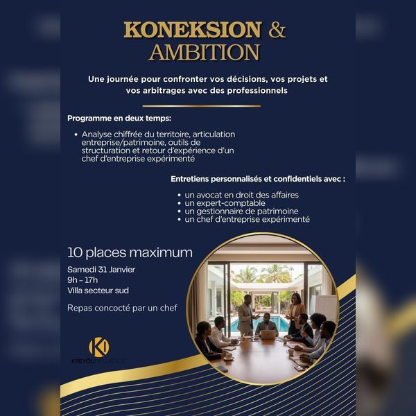 KREYOL INFLUENCE présente « Koneksion & Ambition », une journée immersive et stratégique conçue pour les dirigeantes et dirigeants qui souhaitent confronter leurs décisions, leurs projets et leurs arbitrages à l’expertise de professionnels aguerris. Cet événement s’adresse à des entrepreneurs déjà en activité, conscients que la croissance ne repose plus uniquement sur l’intuition, mais sur des choix structurés, assumés et alignés avec une vision long terme.
