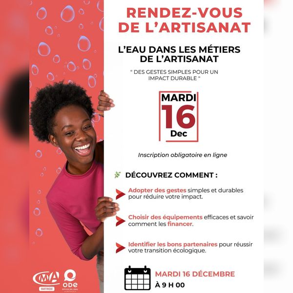 La Chambre de Métiers et de l’Artisanat de Martinique vous invite à un Rendez-vous de l’Artisanat consacré à la thématique : « L’eau dans les métiers de l’artisanat : des gestes simples pour un impact durable ». Cette session s’adresse à tous les artisans souhaitant réduire leur consommation d’eau, adopter des pratiques plus respectueuses de l’environnement et découvrir des outils concrets pour améliorer leur efficacité.