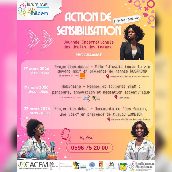 Dans le cadre des actions de sensibilisation organisées autour de la Journée internationale des droits des femmes, la Mission Locale Centre Martinique propose une projection du documentaire Des femmes, une voix. Cet événement a pour objectif de mettre en lumière les parcours, les engagements et les luttes menées par des femmes pour faire entendre leurs voix et défendre leurs droits dans différents domaines de la société.