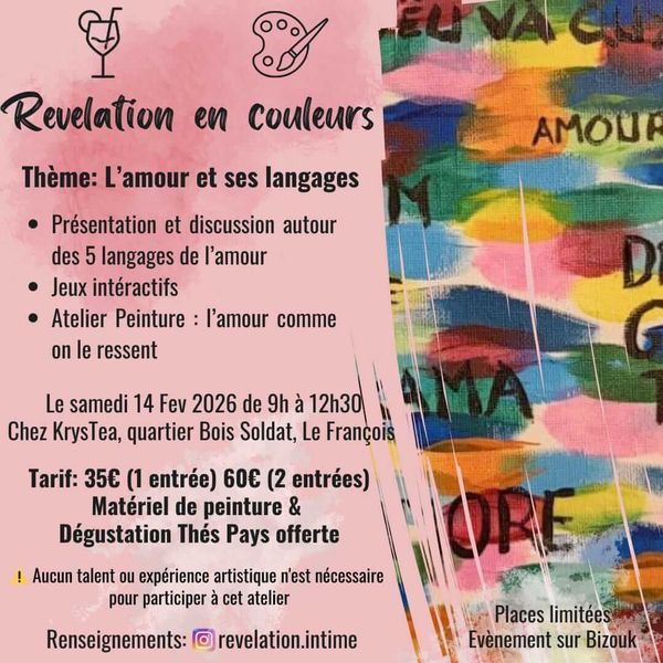 Après plusieurs éditions couronnées de succès, l’atelier Révélation en couleurs revient avec un thème puissant et universel : “L’amour et ses langages”. Cet événement immersif vous invite à explorer les différentes façons d’aimer et d’être aimé à travers des échanges, des jeux interactifs et une session de peinture intuitive.