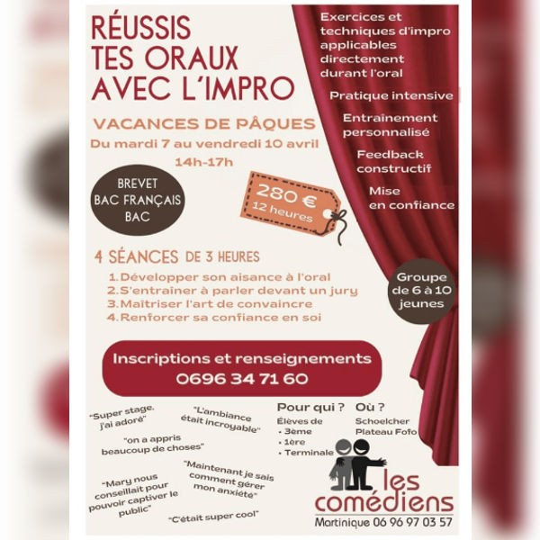 Stage Vacances Réussir ses Oraux avec l’Impro 2026 est un programme intensif conçu pour accompagner les élèves dans la préparation de leurs examens oraux. Le brevet, le bac français et les épreuves du baccalauréat exigent bien plus que des connaissances académiques. Ils demandent de l’aisance, de la clarté, de la confiance et la capacité à convaincre face à un jury.